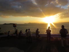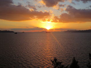 1日目は、笠岡港に集合し普通便の連絡船に揺られて35分で白石島へ到着。天気予報では夕陽が見られないと思っていましたが、午後より天気が回復しました。 この時期はユースホステルの前の海に夕陽が沈まないため、島の南の海が見える峠まで歩いて登りました。この小高い岬からの夕日は島々や船をシルエットに染めて最高の夕陽でした。 (写真は島の南西小高い峠よりの夕陽)