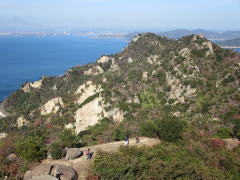 ![]() 特別料理のメニューが2種類? 2日目はすばらしい快晴に恵まれ、島の展望台を巡る遊歩道を歩きました。(写真は高山展望台、標高150m) 遊歩道の周りにあちこちに鮮やかに色づいたウルシ、カエデ,モミジ等が残り印象的でした。 周囲の笠岡諸島の島々はもちろん、四国の山々、吉備高原の山並み、水島の工業地帯、瀬戸大橋もよく見えていました。